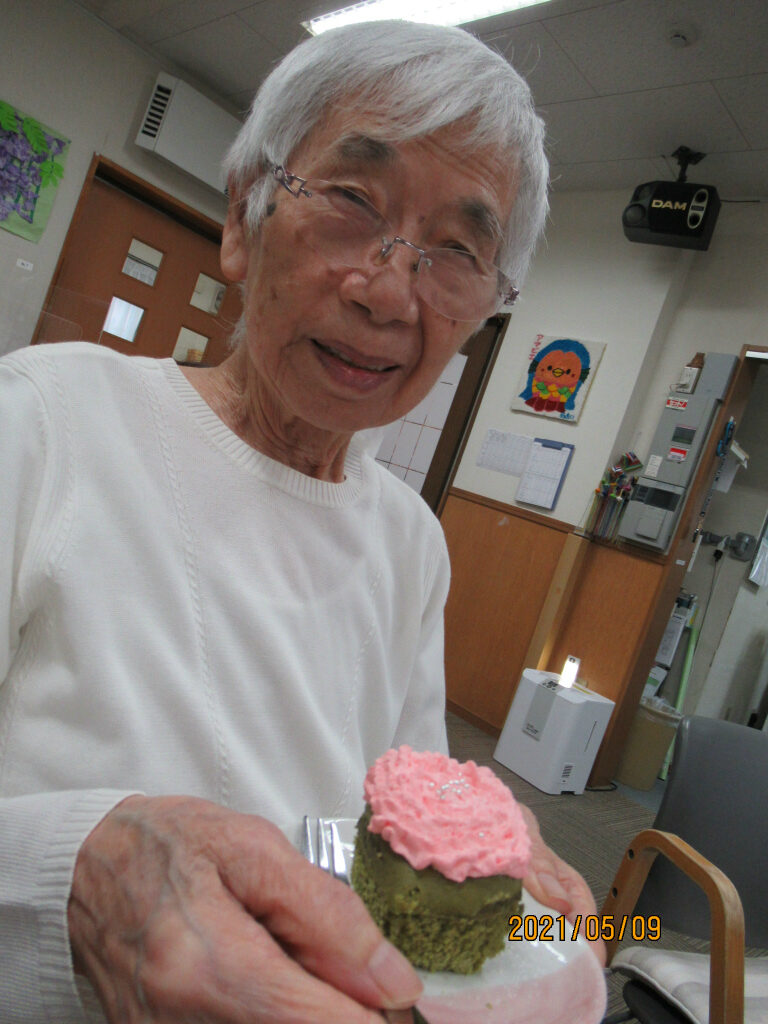抹茶のカップケーキを食紅で色付けした生クリームでデコレーション