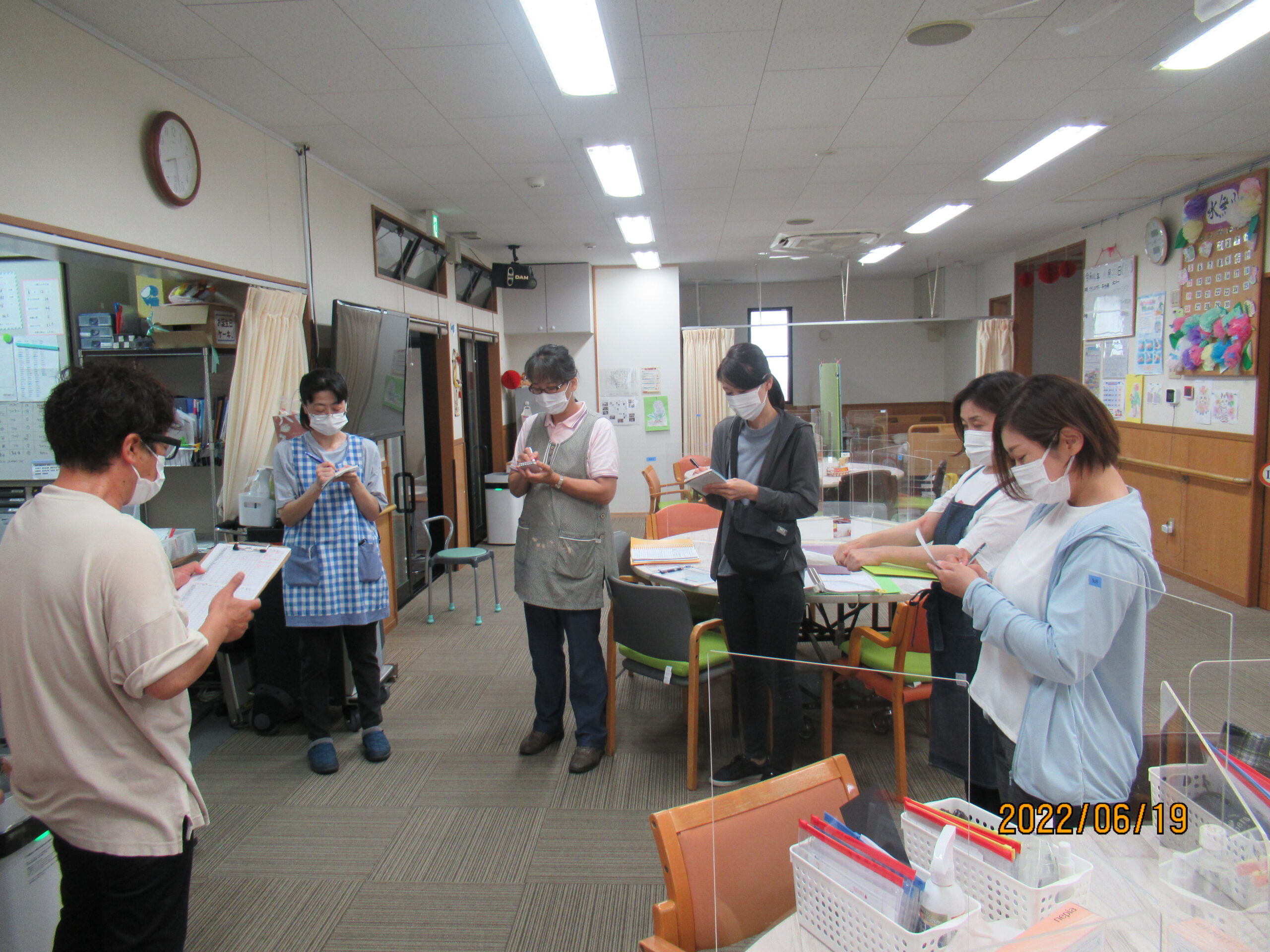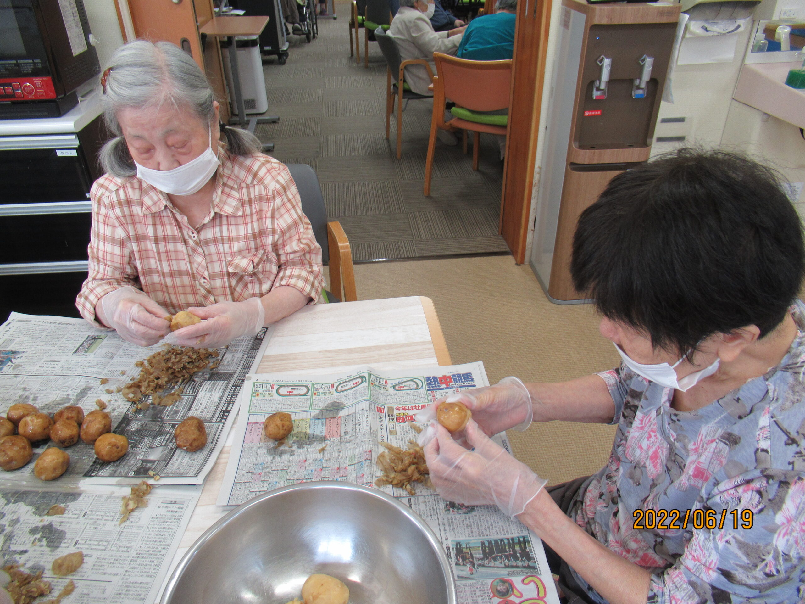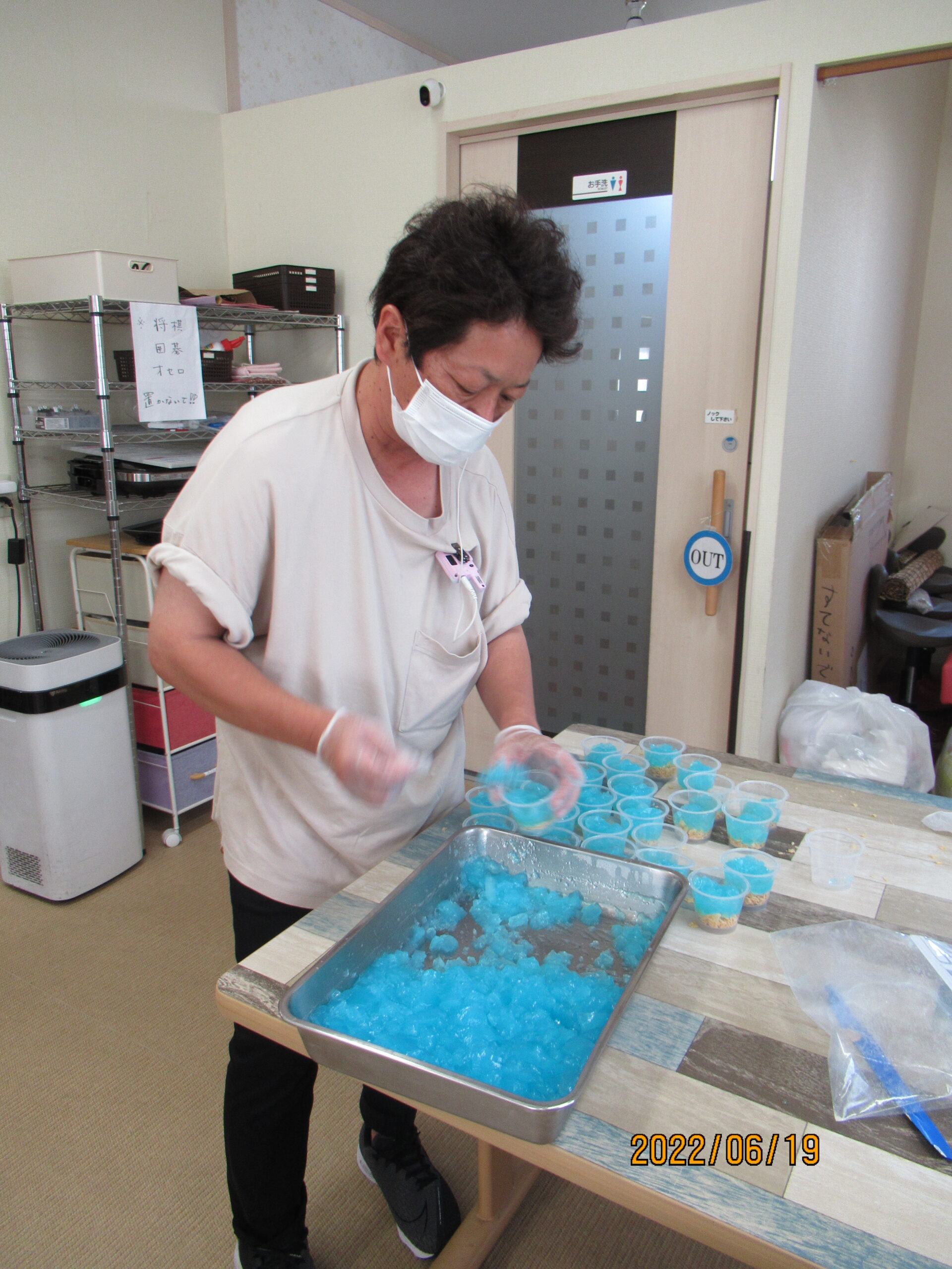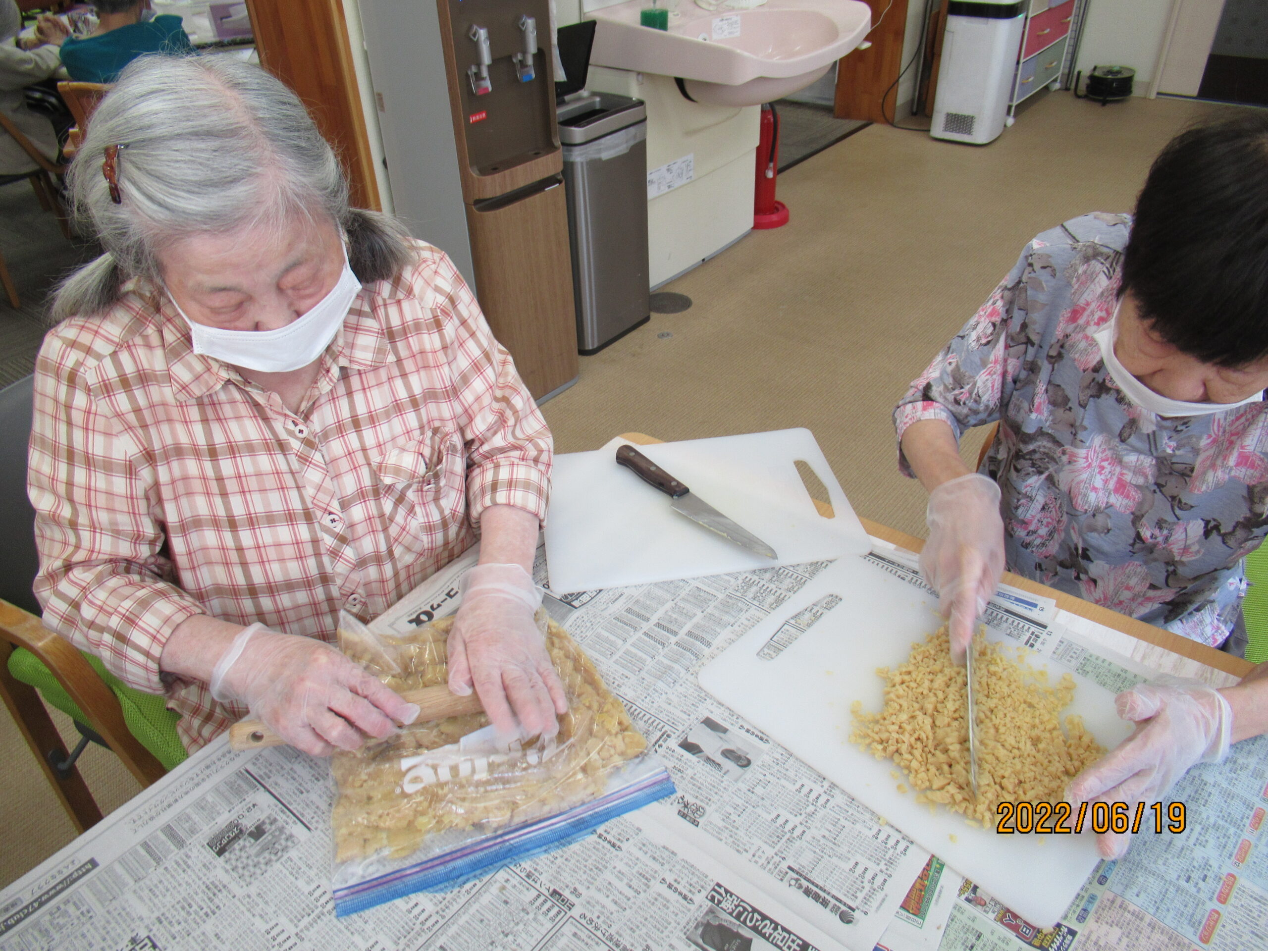 利用者様・施設長を巻き込んでの、おやつ作りとなりました![]()