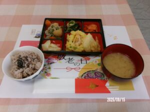 昼食は赤飯と天ぷらがメインのお祝い御膳です😊