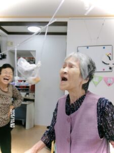 難易度を上げ、職員の頭上にカゴを乗せた玉入れに挑戦していただきました。