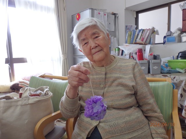 室内では、お花紙で紫陽花の吊るし飾りを作られました。