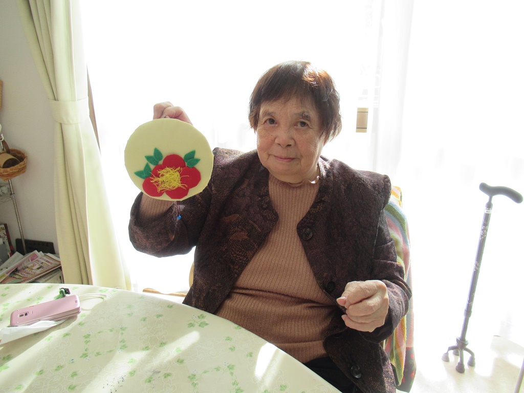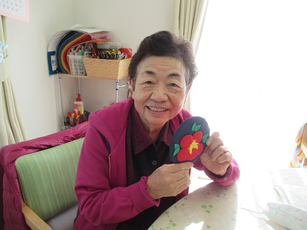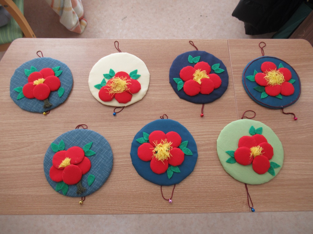 椿の芯を広げて立体的にされている利用者様の作品を見られ、他の利用者様も