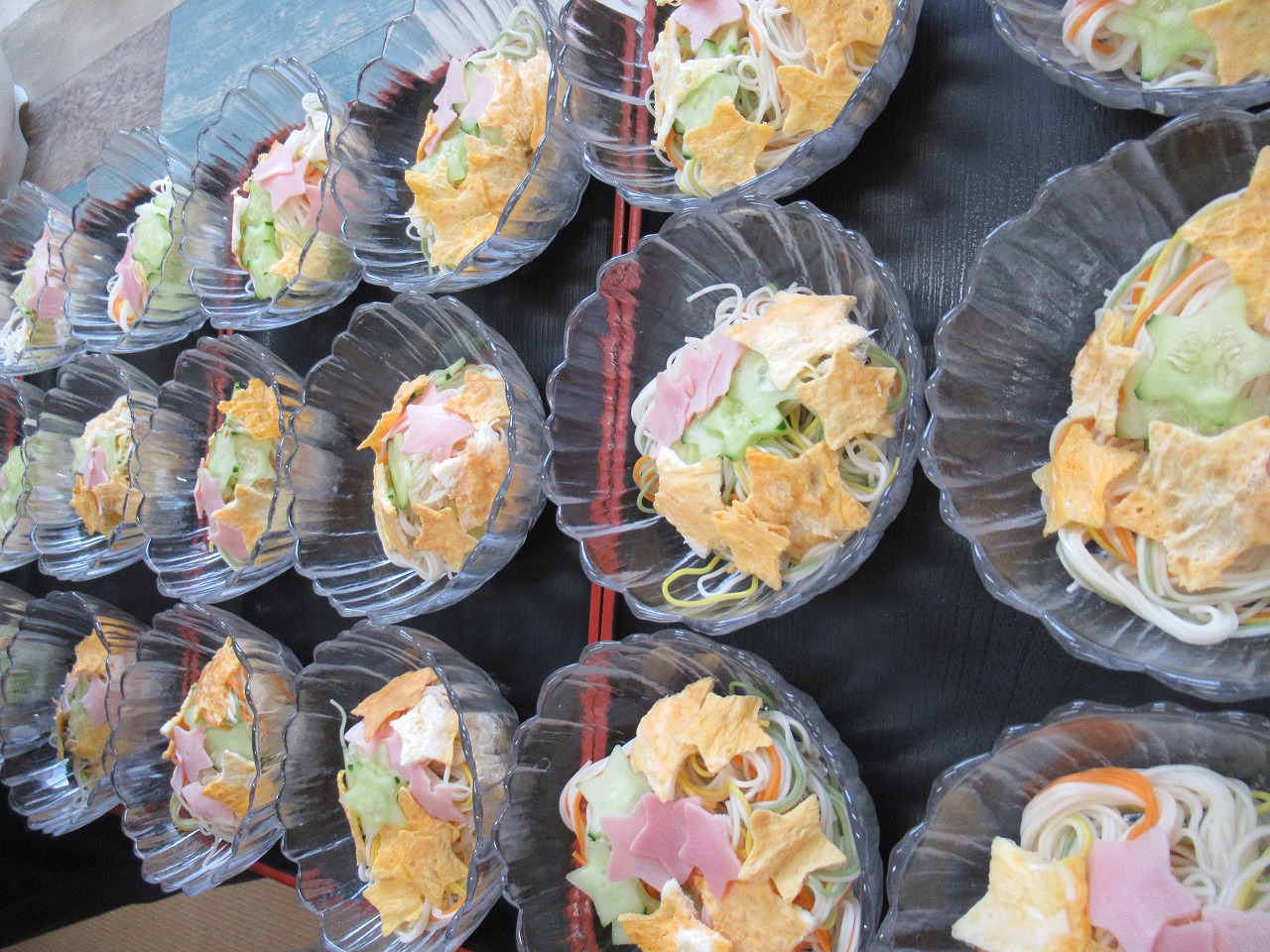 そうめんに、星形きゅうり・たまご・ハムを載せていきます🥒🥚🥓