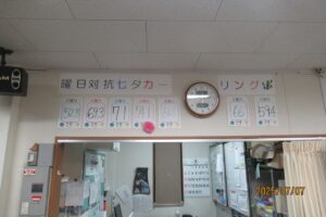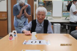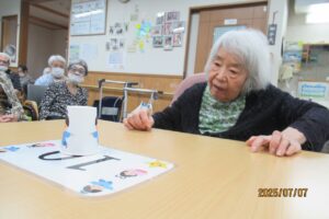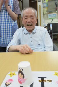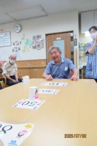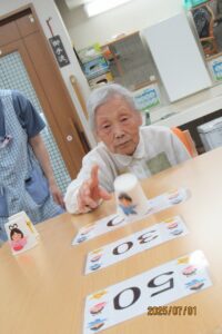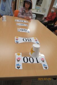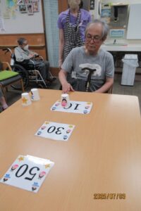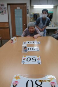 ゴルフボールに紙コップを被せ転がし、点数的の上にとめるゲーム✋