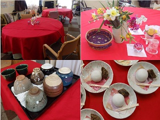 USENで、お琴の調べを流し、赤いテーブルクロスにお花を活け、