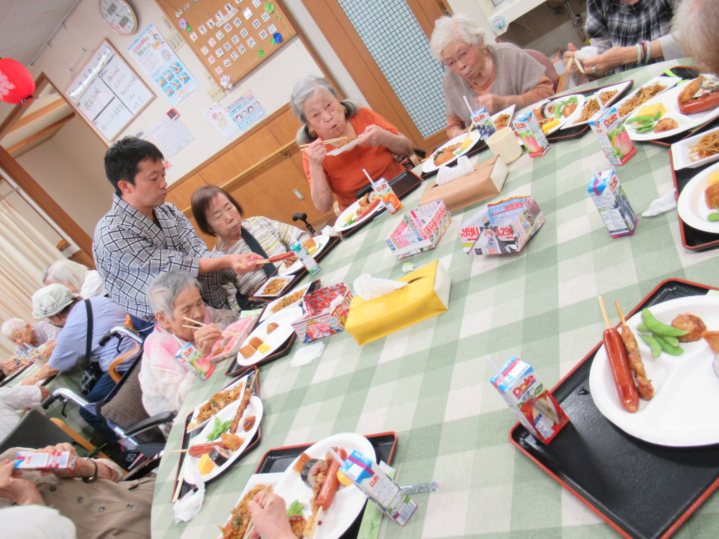 昼食は”祭りメシ!”をコンセプトにフランクフルト・焼き鳥・枝豆・たこ焼き・稲荷ずし・太巻き寿司・厚焼き玉子・焼きそばをバイキング形式で用意しました