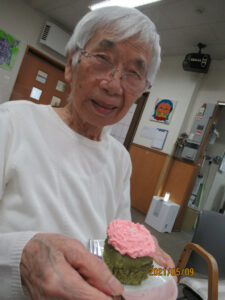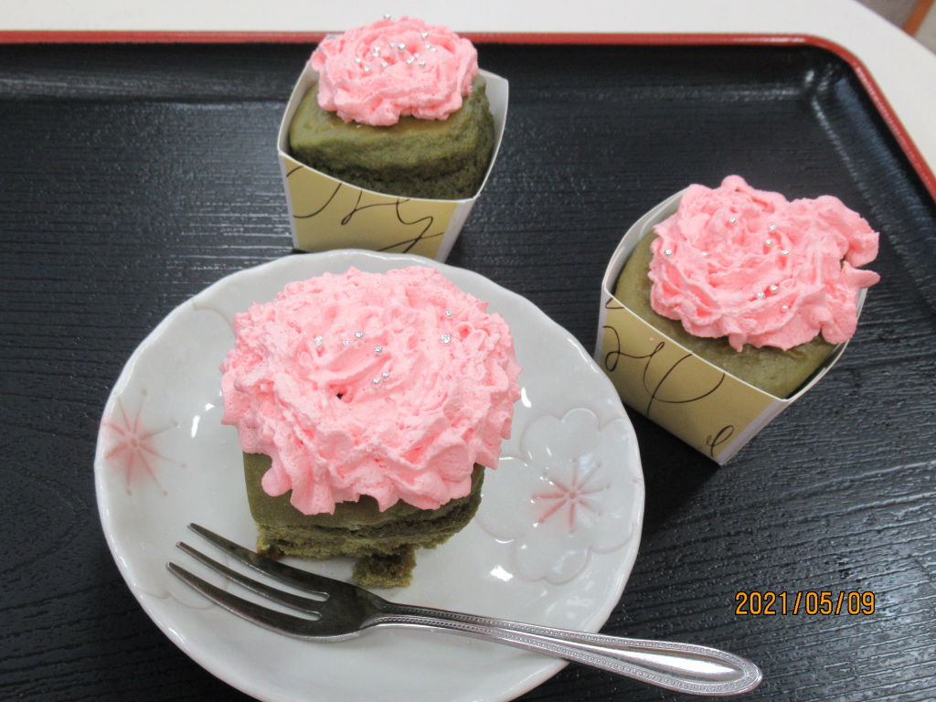 抹茶のカップケーキを食紅で色付けした生クリームでデコレーション![]()
