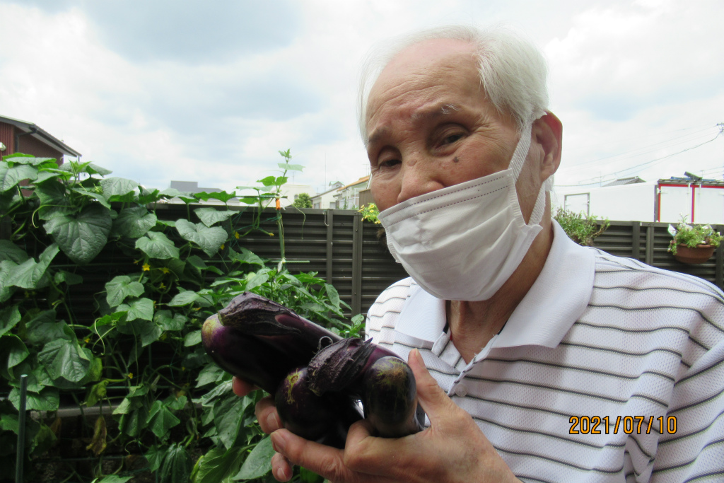 気持ちのいい日差しを浴びながら、あおい菜園のナスとバジルを収穫して