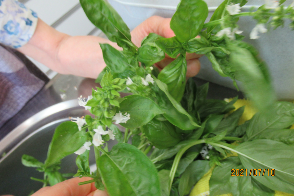 ↑「バジルの花は白いんですね~シソの花みたい」