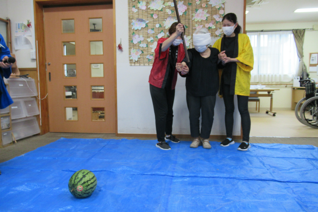 夏祭り、目玉の催しとしてスイカ割りを行いました![]()