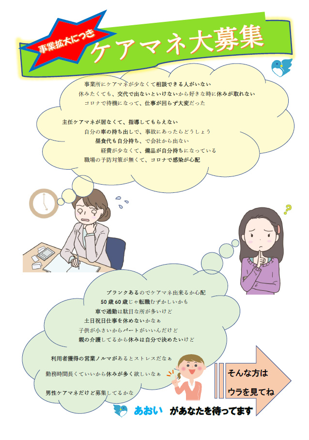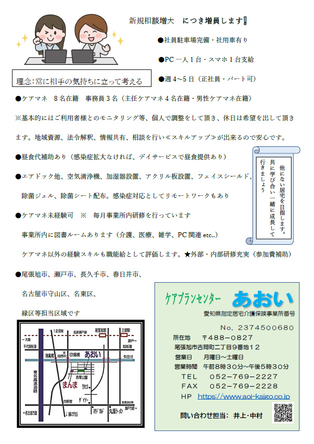 現在、ケアプランセンターあおいでは事業拡大につき ケアマネを募集しています!