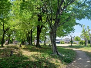 ケアプランセンターあおいの目の前には、緑豊かな吉岡公園が広がっています。