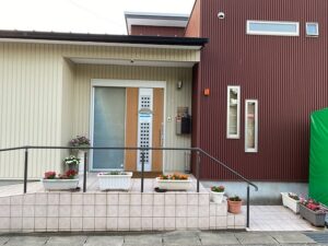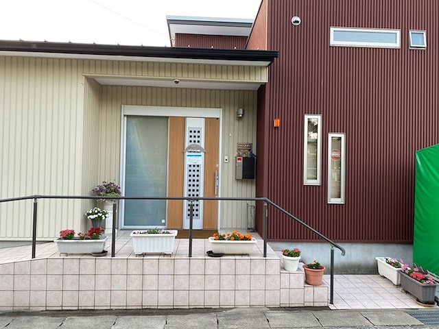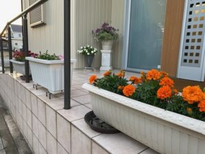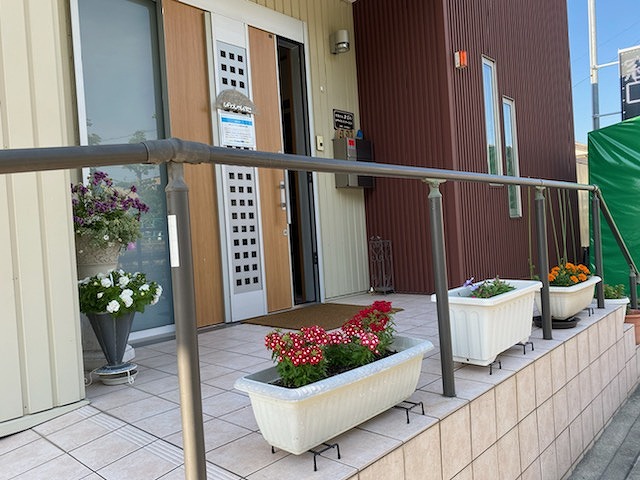 ケアプランセンターあおいの玄関の前にプランターがたくさん置いてあります。