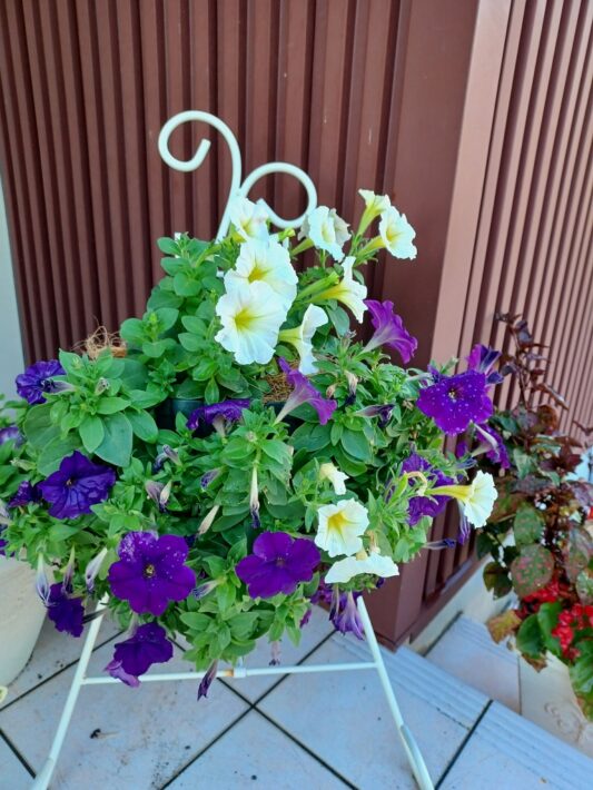ハンギングバスケットをウィンブルドンカラーにしてみました。