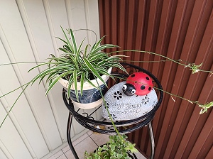テントウ虫の置物が、緑の中に可愛いアクセントになっています。🐞🌲