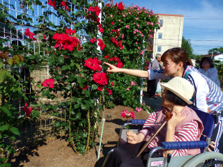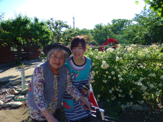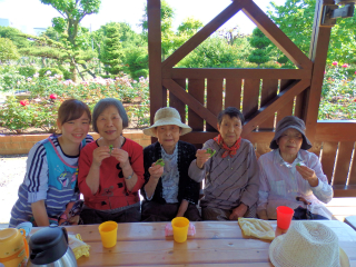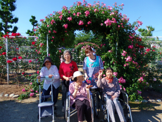 まんま歩行練習バラ園にて 2016 5/18 まんま日記 2016年5月18日 歩行練習でバラ園に行ってきました 「たくさん咲いてるね~。」 きれいなバラたちにうっとり 「お腹がすいたから、おやつにしようよ~。」 たくさんのバラを見ながらのおやつタイムです 「きれいですねぇ~。」 「私、この赤色のバラが一番好きだわ」 最後にバラのアーチの前で、「はい、ポーズ」 青空の最高のお天気の中で、 バラに囲まれた歩行練習は、 少し暑いくらいでしたが、 みなさんにこにこ笑顔でした。 まんま日記