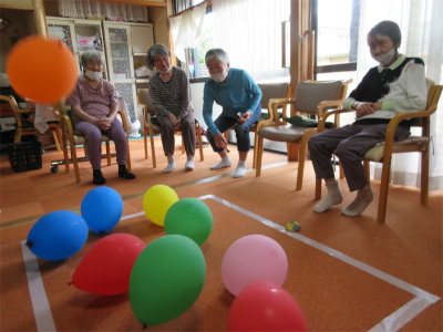 風船にめがけてお手玉を投げてもらい、テープの枠から風船が出た数を競う