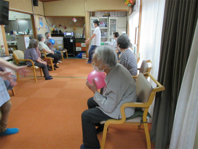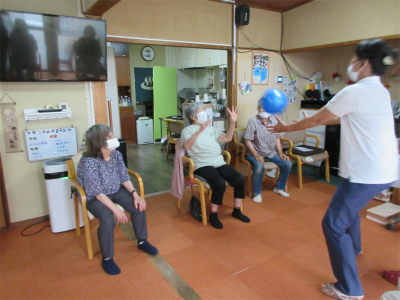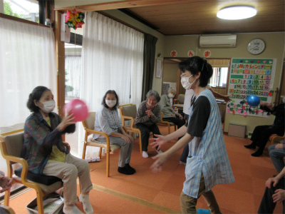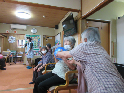 2チームに別れて職員がお一人ずつにボールを投げ、返してもらうゲームで競い合いました![]()