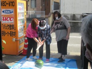 皆さん一人ひとり、目隠しをして、棒でスイカに触れてもらいました!