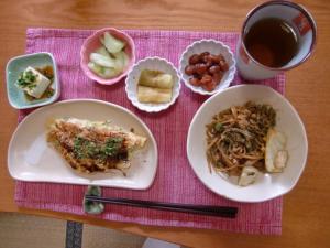 お好みやきとやきそば。きゅうりの即席漬物・ナスの煮びたしも作りました。お好み焼き担当Sさん。野菜をきる