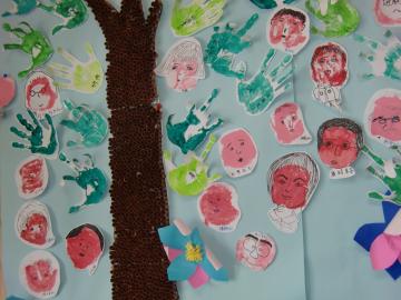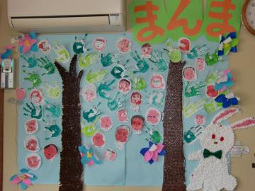 葉っぱは、片手全部に緑色の絵の具をつけて、