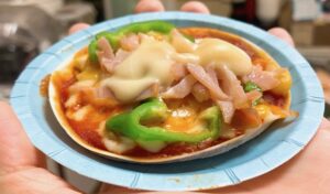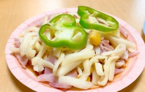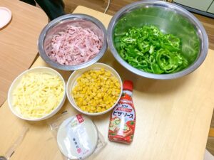 ハム、ベーコン、ピーマンを切ってピザ用の生地に沢山のせてチーズもたっぷり![]()