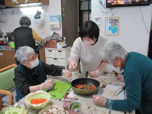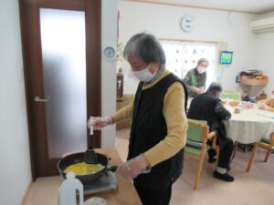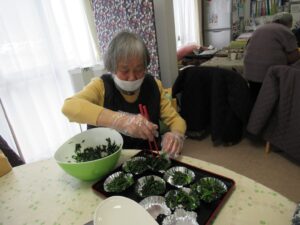 材料を切ったり、卵を焼いたり、具を煮詰めたり、鮭を蒸したり、利用者様も