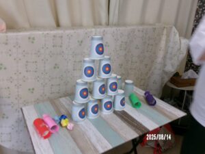 今年の射的はトイレットペーパーの芯で作った銃と折り紙を丸めた玉を使い、手作り感満載の射的となりました。