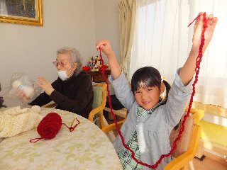 お次は 出来上がった鎖編みの毛糸で あやとり。