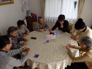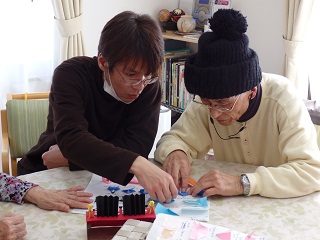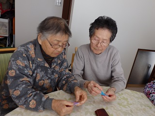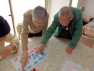 利用者様がお互いに教えあいながら、また、職員と共に見本を見ながら折っています。