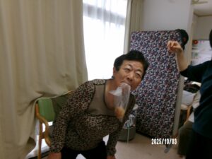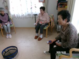 難易度を上げ、職員の頭上にカゴを乗せた玉入れに挑戦していただきました。