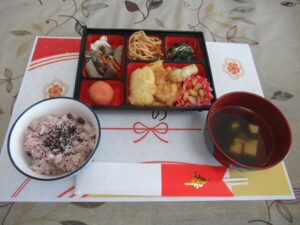 昼食は赤飯とメインが天ぷらのお祝い御膳