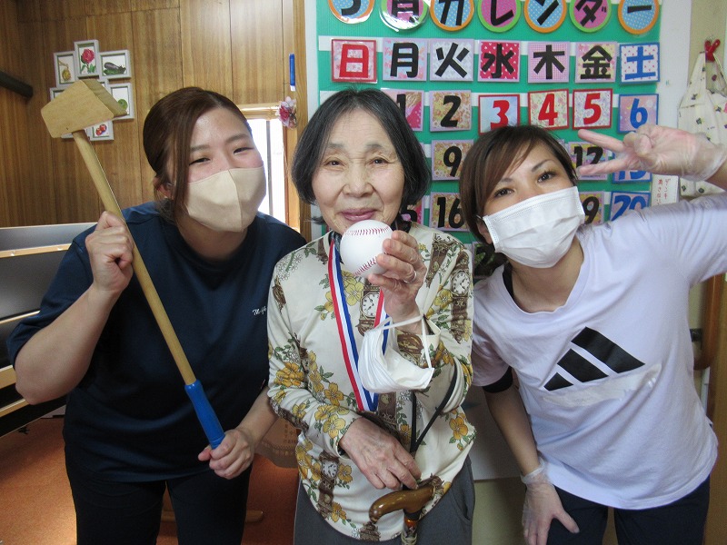尾張旭市のデイサービス「まんま」ですこんにちは~( *´艸`)♪まんま夏祭り次の日~☆彡スイカ🍉割ですっ~☆彡今日は天気も良く、少し風があり、涼しかったので皆さんと外でスイカ割り🍉を楽しみましたぁ~( *´艸`)♪ -